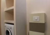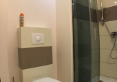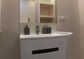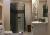 Łazienka jest  duża z kabiną prysznicową, umywalką, lustrem oraz WC.