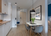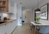 Mieszkania składa się  z pokoju dziennego, z którego jest bezpośrednie wyjście na balkon o powierzchni ok. 4 m² ze stolikiem i dwoma krzesłami.