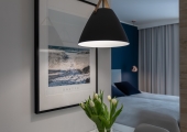 Na wyposażeniu pokoju jest łóżko sypialniane 160 cm x 200 cm, stoliki nocne z radio-budzikiem, sofa z funkcją spania, stół z 3 krzesłami, odbiornik TV, apple TV, internet, komoda, lampa stojąca oraz stolik