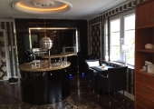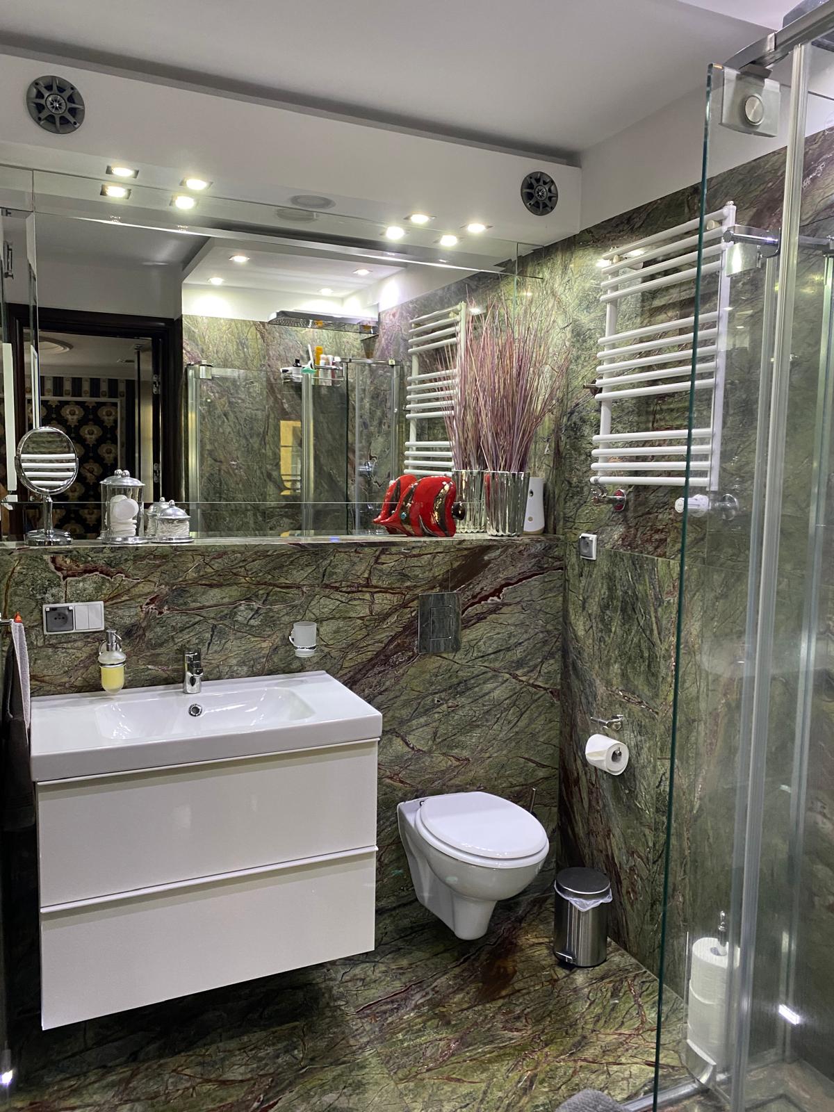 Łazienka wyposażona jest w umywalkę, lustro, wc, kabinę prysznicową oraz armaturę łazienkową o bardzo wysokim standardzie.