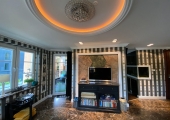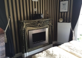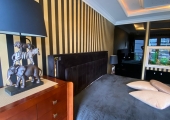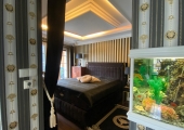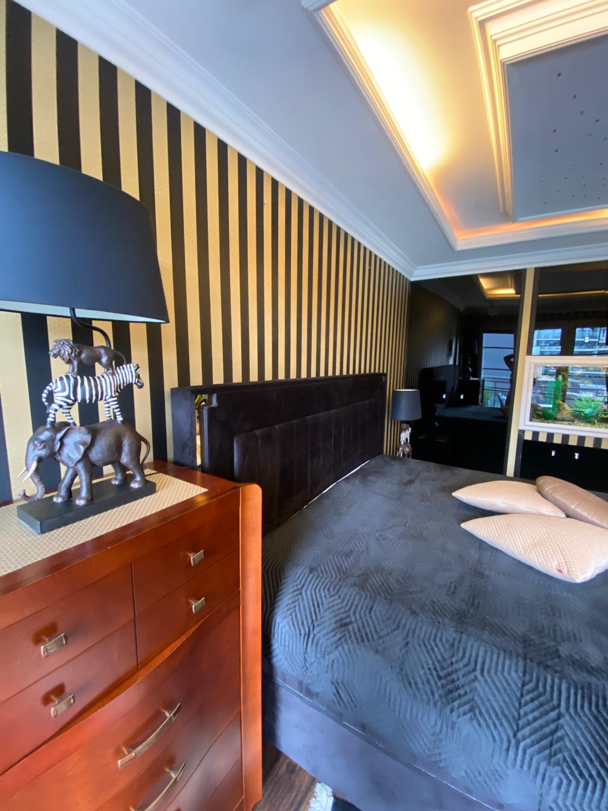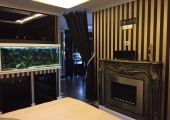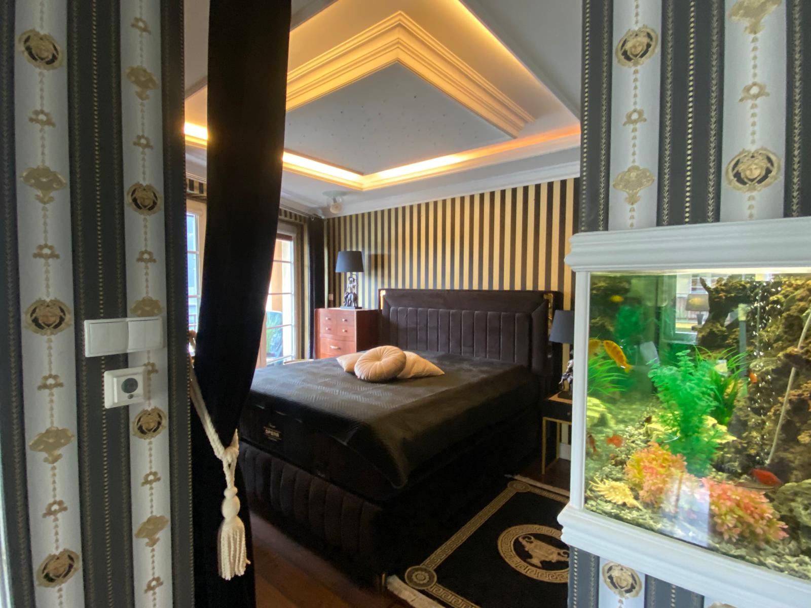W sypialni na wyposażeniu jest typowe łóżko małżeńskie, duża szafa, bio kominek oraz akwarium.