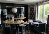 Przestronny salon wraz z aneksem kuchennym wyposażony jest w rozkładany narożnik z możliwością spania dla 2 osób, stolika, stojaka z TV i dekodera tv cyfrowej. W aneksie kuchennym znajduje się sprzęt AGD wraz z ekspresem do kawy, kuchenką mikrofalową, piekarnikiem, dużą lodówką oraz czajnikiem bezprzewodowym. Kuchnia ma do dyspozycji naczynia dla 6 osób oraz komplet do gotowania.