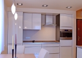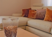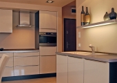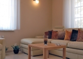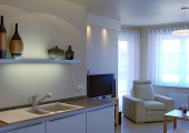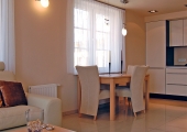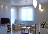 Apartament jest urządzony nowocześnie i tak, że zapewnia komfort oraz wygodę osobom w nim przebywającym. Składa się on z pokoju dziennego połączonego z aneksem kuchennym. Z tego też pokoju jest bezpośrednie wyjście na balkon. W salonie znajduje się nowoczesny skórzany narożnik z funkcją spania dla dwóch osób, komoda, odbiornik TV, odtwarzacz DVD, stół z czteroma krzesłami oraz stolik.