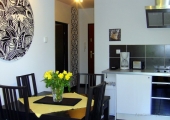 W pokoju dziennym z aneksem, na wyposażeniu znajduje się stół i cztery krzesła oraz mała sofa.