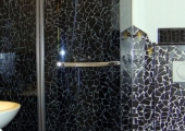 Łazienka jest duża, komfortowa z kabiną prysznicową, umywalką, pralką, lustrem i WC.