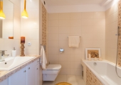 Łazienka na pierwszym poziomie jest duża z wanną, umywalką, lustrem oraz WC.