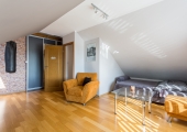 Na drugim poziomie apartamentu mamy przestronny pokój z rozkładaną sobą z funkcją spania dla dwóch osób. Duża zabudowana szafa, telewizor, fotel, szklany stolik.