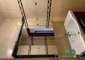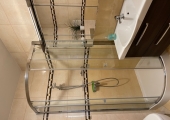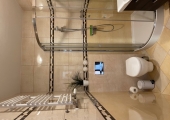 Łazienka jest duża, komfortowa z kabiną prysznicową, umywalką, lustrem i WC.
