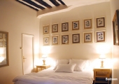 W sypialni znajduje się duże łóżko małżeńskie, na którym można dobrze odpocząć po całym dniu, stoliki nocne wraz z lampkami oraz zabytkowa szafa na ubrania i bagaże.