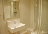 Z sypialni jest wejście do łazienki z umywalką, prysznicem oraz toaletą.